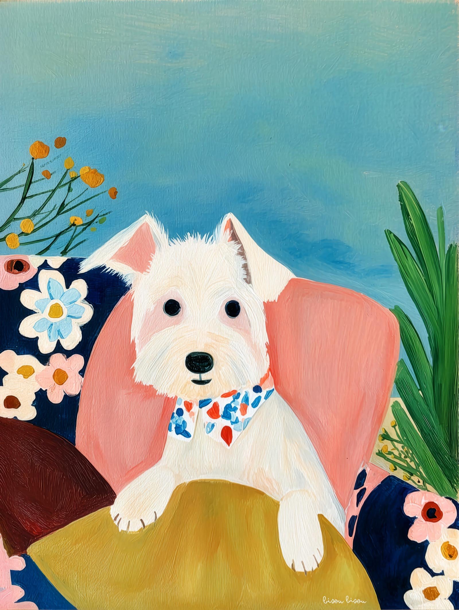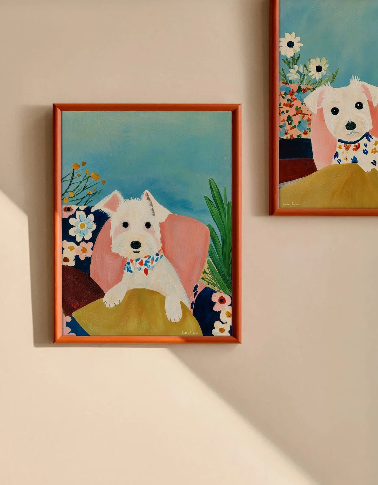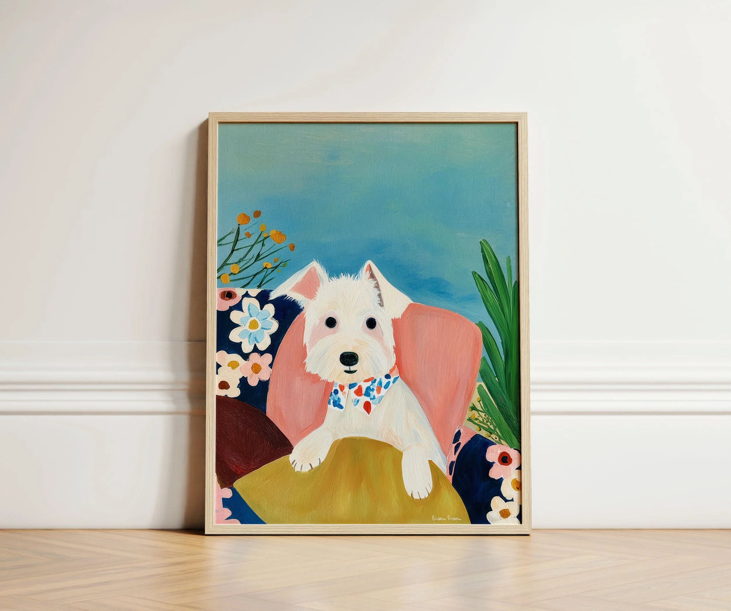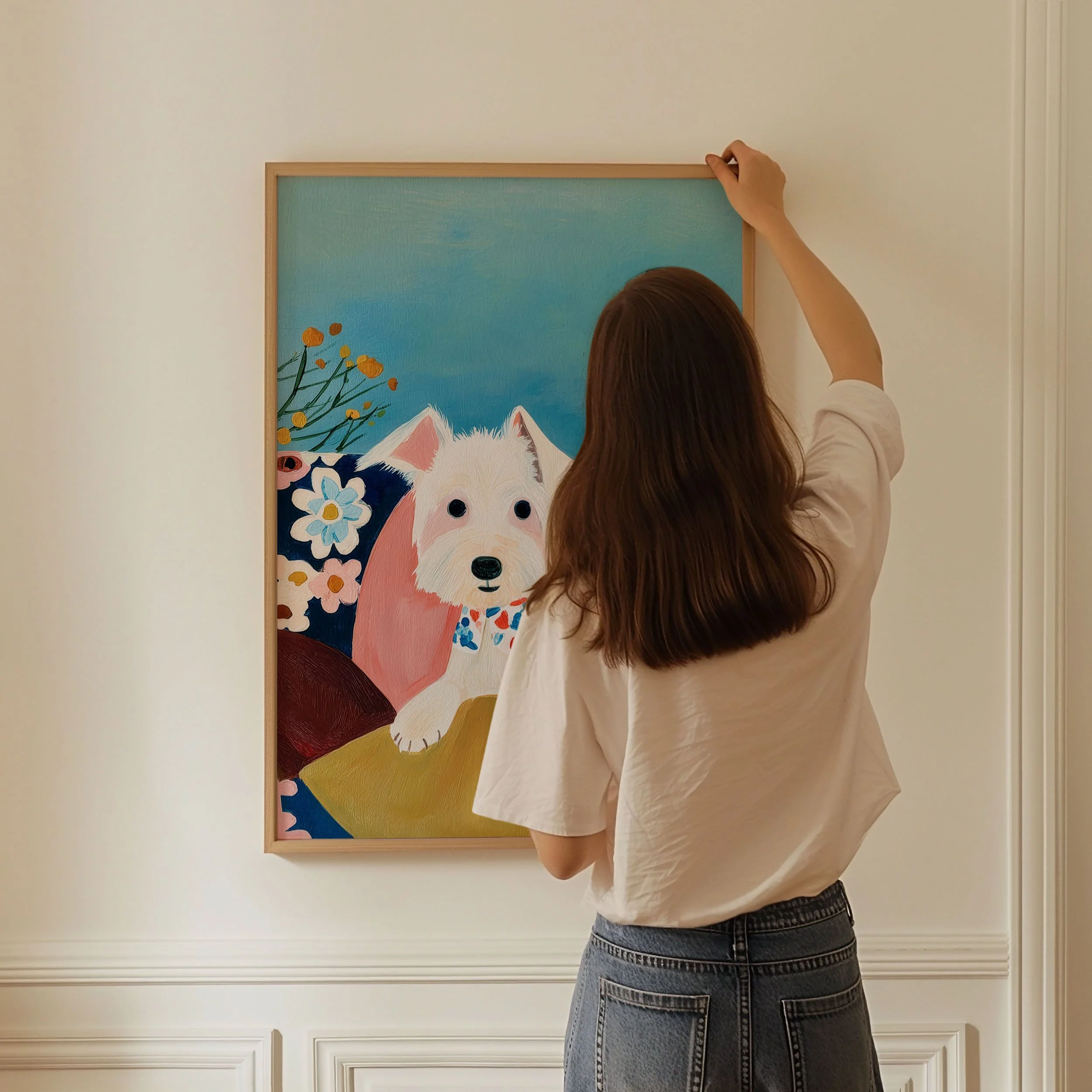 Bright, painterly posters that bring a warm, quirky energy to any room. This design features a cheerful white terrier rendered in bold brushstrokes and saturated color—flowers, lush greens, and a cozy chair create a friendly, storybook scene. Rolled for safe shipping, each print keeps the texture and vibrancy of the original artwork while fitting easily into frames or gallery-style clips. Place it in a sunlit entryway, a playful nursery nook, or above a home office desk to brighten the day and spark a smile.